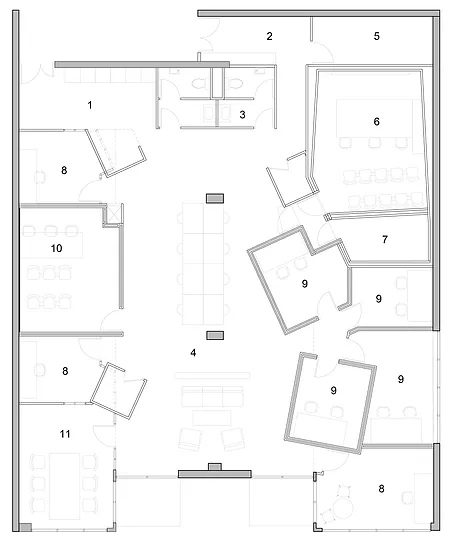 Les salles techniques tels que auditorium, salles de montage et d'étalonnage sont conçues et réalisées comme des boîtes déstructurées, reliées entres elles par des cloisons.